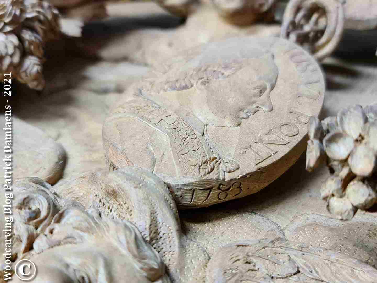 Want in die korte 20 minuten dat ik het medaillon heb kunnen bekijken stelde ik mezelf reeds een aantal cruciale vragen: hoe kon Aubert Parent bepaalde technische problemen realiseren zoals houtstructuur, onderin snijden, maken van een gladde ondergrond, snijden zonder dat iets afbreekt en kraaknet afwerken van de zijkanten.